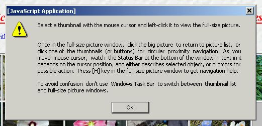 Click this link to have a look at simple example of picture album. Click [Help] button in thumbnail window (generated by THUMBLST JavaScript), and press [H] key in full-size picture display window to get navigation help. Here is thumbnail list navigation help: